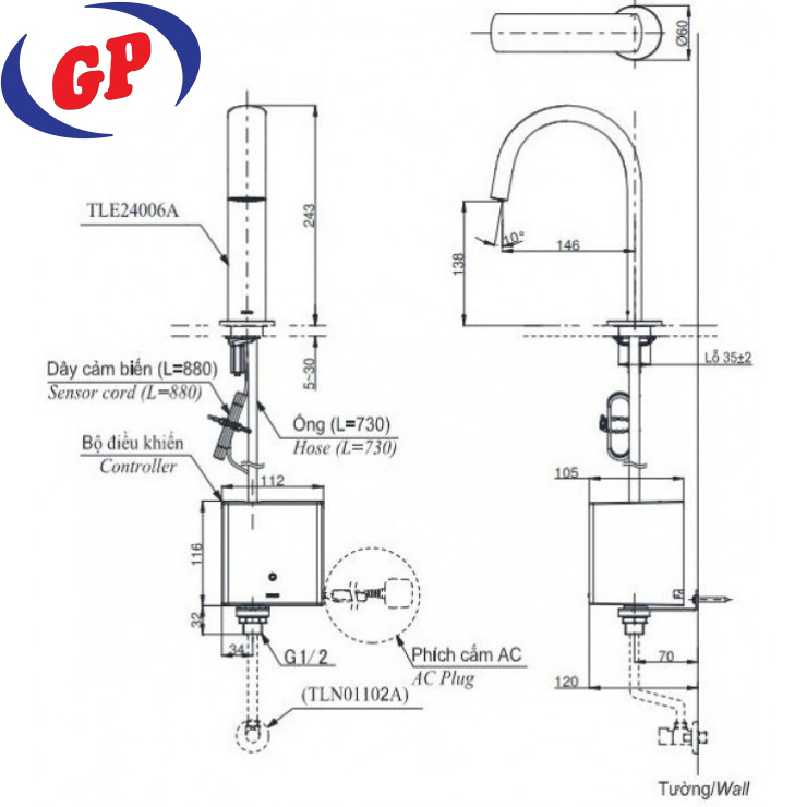 Vòi Lavabo Cảm Ứng TOTO TLE24010A/TLE01502A1/TLN01102A Gắn Tường 220V 2L