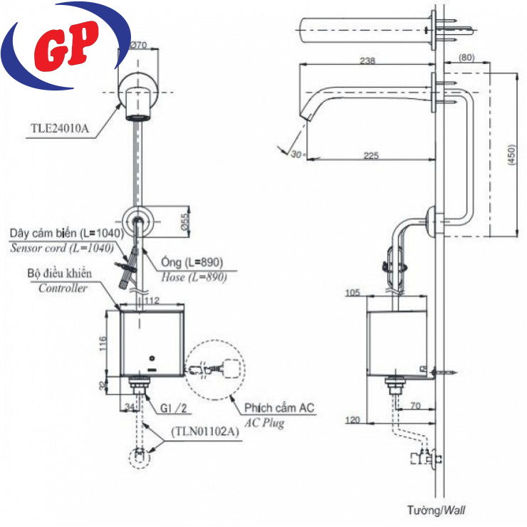Vòi Lavabo Cảm Ứng TOTO TLE24010A/TLE01502A1/TLN01102A Gắn Tường 220V 2L